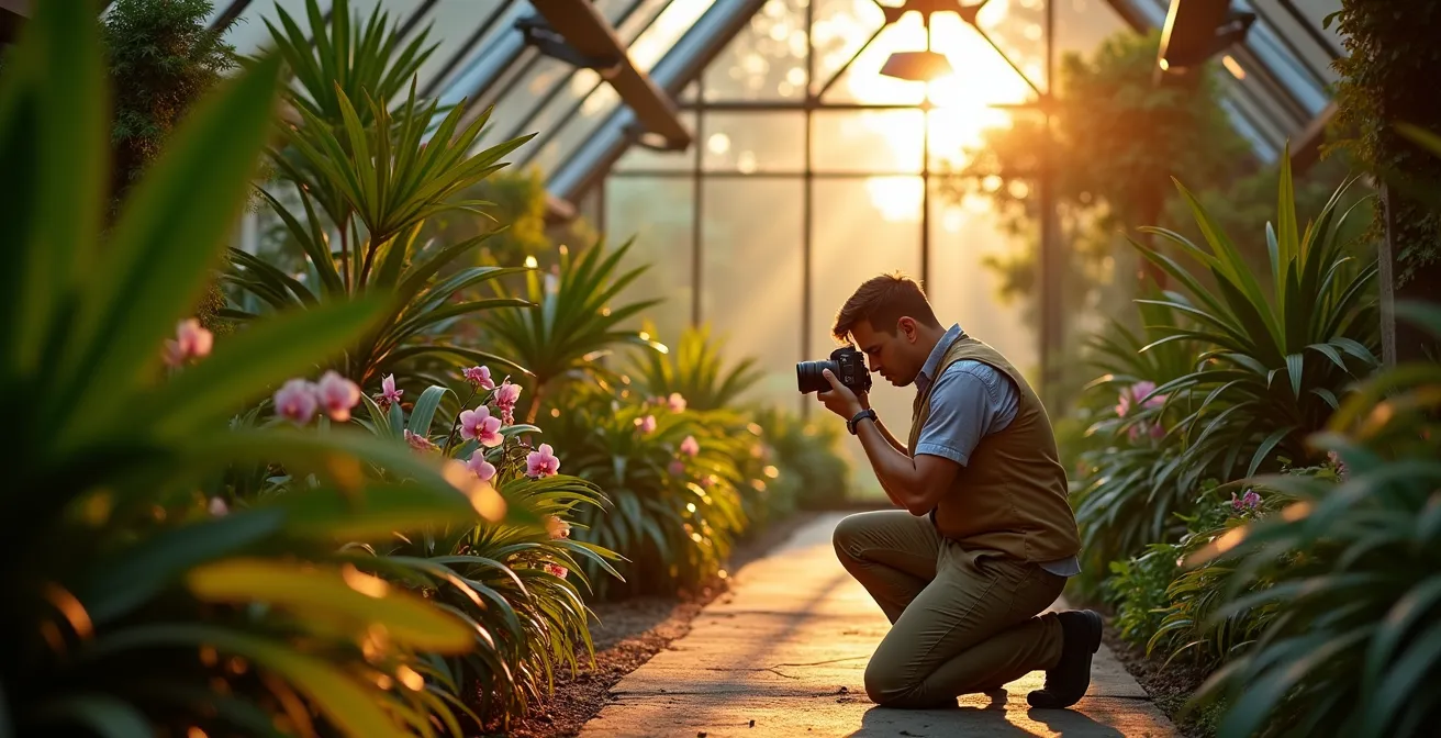 Para el fotógrafo de naturaleza, un jardín botánico es mucho más que una colección de plantas; es un lienzo vivo que cambia con cada minuto que pasa. La mayoría de los consejos se centran en la búsqueda obsesiva de la «hora dorada», ese breve instante de luz suave y cálida al amanecer o al atardecer. Se nos dice que evitemos el sol del mediodía, que esperemos a que el viento amaine y que busquemos la perfección técnica por encima de todo. Esta aproximación, aunque segura, a menudo nos hace perder la verdadera alma del jardín: su constante transformación.